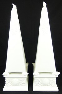 28 - PR ITALIAN MAJOLICA POTTERY OBELISKS SIGNED Pair of Italian Majolica pottery obelisks decorated with shells and sea-forms. Each Marked 1551 Costa Italy. One holds Saks Fifth Avenue label to underside. Each measures 20 3/4" height.