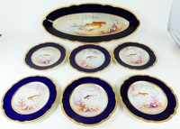 2 - 7pc LIMOGES M. REDON PORCELAIN FISH SET Martial Redon Limoges porcelain fish set. Includes six plates-8 7/8" and serving platter-23 1/4". Each hand painted scene is signed LUC lower right. Each piece is marked M Redon Limoges to underside.