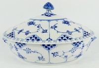 31 - ROYAL COPENHAGEN BLUE FLUTED OVAL SERVING DISH Royal Copenhagen porcelain oval covered serving dish in the Blue Fluted Full Lace pattern. Marked to underside. Measures 10 3/4" length including handles.