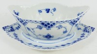 32 - ROYAL COPENHAGEN BLUE FLUTED FULL LACE GRAVY BOAT Royal Copenhagen porcelain gravy boat with fixed saucer in the Blue Fluted Full Lace pattern. Marked to underside. Measures 9 1/2" length.
