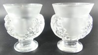 39 - PR LALIQUE CRYSTAL 'ST CLOUD' VASES Pair of Lalique frosted crystal Saint Cloud footed Acanthus leaf vases. Each signed Lalique France to underside and measures 4 5/8" height x 4" width.