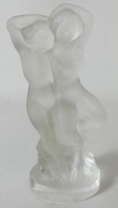 41 - LALIQUE FAUNE w NUDE FROSTED CRYSTAL FIGURINE Lalique frosted crystal sculpture depicting two nude figures. Side Lalique France to underside. Measures 5 1/2" height.