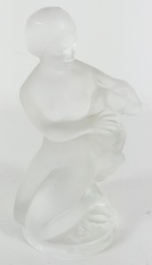 42 - LALIQUE DIANA THE HUNTRESS FROSTED CRYSTAL FIGURE Lalique frosted crystal figurine depicting Diana, Goddess of the Hunt. Signed Lalique France to underside and holds remnant of original label. Measures 4 1/2" height.