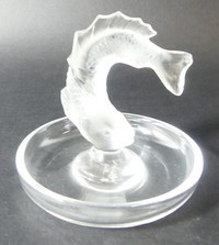 43 - LALIQUE CRYSTAL KOI FISH RING HOLDER Lalique frosted crystal koi fish ring holder. Signed Lalique France to underside. Measures 3 1/2" height x 3 3/4" diameter.