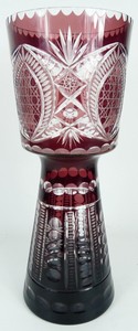 45 - BOHEMIAN AMETHYST CUT TO CLEAR CRYSTAL VASE Bohemian amethyst cut to clear crystal centerpiece vase. Measures 18" height x 7" diameter.