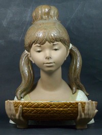 47 - LLADRO 'GARDENER GIRL' PORCELAIN FIGURINE w BOWL Lladro 'Gardener Girl' #2017 gres porcelain figure. Depicts the head / bust of a girl with pigtails holding a basin of water. Marked to underside of bust. Measures 16 1/2" height.