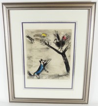 7 - MARC CHAGALL 'ROOSTER AND THE FOX' COLOR ETCHING Marc Chagall color etching titled 'The Cock and the Fox'. Pencil signed lower right. Plate 22 from La Fontaine "Fables". One of 100 signed impressions. Measures 14 3/8" x 10 3/8" + 4" mat and frame.