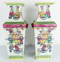 10 - PR CHINESE FAMILLE ROSE PORCELAIN VASES Pair of Chinese Famille Rose porcelain vases of squared form. Each having mask ring handles and depictions of figural courtyard scenes to body. Each measures 16 1/8" height.