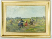 11 - ELIA SALA 'RUSSIAN SUBJECTS' OIL PAINTING ON BOARD Elia (Emilio) Sala (Italian, 1864-1920) oil painting on board depicting Russian figures dancing in a field. Signed lower right. Titled 'Soggeti Russi' and holds Gustavo Baldissera, Roma label to verso. Measures 16 1/4" x 11" + 2 1/8" frame.