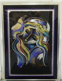 13 - MARTIROS MANOUKIAN 'DEMURE SPIRIT' SERIGRAPH Matiros Manoukian (Armenian, b. 1947) embellished serigraph depicting a portrait of a girl. Titled Demure Spirit. Signed lower right and numbered 9/80 lower left. Measures 43 x 28 1/2" + 6" mat & frame.