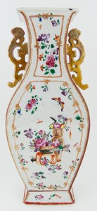 15 - 18th C CHINESE FAMILLE ROSE PORCELAIN VASE Chinese Qianlong Famille Rose porcelain handled vase. Decorated with florals and insects throughout. Measures 11" height. Note: Drilled to underside.