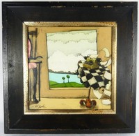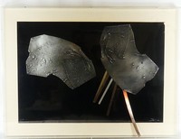 19 - SICA MIXED METAL COMPOSITION FRAMED Sica (American, b.1932) mix metal composition framed in shadowbox. Hand signed Sica lower right. Numbered 1/5 (?) lower left. Titled illegibly. Measures 34" x 23" + 3" mat & frame. Note: Acrylic shadowbox has damage.