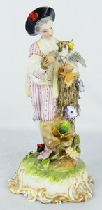 24 - MEISSEN 'MAN w LOVE LETTER' PORCELAIN FIGURINE Meissen porcelain figure depicting a man holding bird with letter. Marked to underside and numbered 163. Measures 7" height.