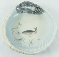 26 - ROYAL COPENHAGEN PORCELAIN CRAB BOWL Royal Copenhagen porcelain dish having crab on side and fish painted inside bowl. Marked to underside. Measures 9 1/2" x 7 3/4".