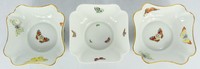 30 - 3pc LIMOGES BERNARDAUD PORCELAIN BUTTERFLY BOWLS Three Limoges France B & C, L. Bernardaud porcelain bowls of squared form decorated with butterflies. Each marked to underside and measures 6 1/2" length x 2 1/4" height.