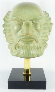 31 - POTTERY BUST OF GREEK GOD Green glazed pottery head in the form of a bearded Greek God, possibly Zeus or Poseidon. Mounted to square black base on gold-tone stand. Measures 19" height x 12 1/4" width.