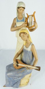 32 - LLADRO 'MELODIES' PORCELAIN FIGURINE #2364 Lladro porcelain musical group figure depicting a seated girl playing Mandolin and standing girl playing lyre. Titled 'Melodies'. Marked to underside. Measures 17 1/2" height.