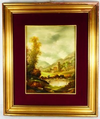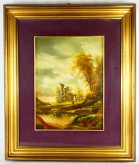 35 - CARLO NATALI 'PAESAGGIO' OIL PAINTING ON BOARD Carlo Natali (Italian, 20th C) oil painting on board depicting a landscape with two figures. Signed lower left. Holds Direzione Artistica Gallerie label to verso. Measures 15" x 11" + 5" mat & frame.
