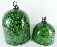 41 - 2pc VISTOSI MURANO GLASS HANGING LAMPS Two Vistosi Murano green glass hanging lights / lanterns having Murrina cane decoration throughout. Each signed Vistosi to bottom outer edge. Smaller measures 10 1/4" diameter x 7 1/2" height. Larger measures 12 1/4" diameter x 13 1/2" height. These measurements exclude the black metal hardware.
