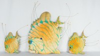 45 - 4pc TODD WARNER PINK AND YELLOW FISH SCULPTURE Todd J. Warner (American, b. 1945) painted clay and wire fish with jeweled embellishments. Three fish painted pink and one painted yellow. The largest measures approximately 13" in length 10" in height.