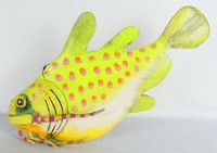 43 - TODD WARNER YELLOW DOTTED FISH SCULPTURE Todd J. Warner (American, b. 1945) painted wood and clay green and pink dotted fish. Measuring approximately 20" in length.
