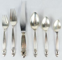 4 - 73pc GEORG JENSEN 'ACORN' STERLING SILVER FLATWARE 73 pieces of Georg Jensen sterling silver flatware in the Acorn pattern. Complete service for 12 plus one serving piece. Includes 12 dinner forks-7 1/2", 12 3-tine forks-6 1/2", 12 dessert / oval soup spoons-6 7/8", 12 spoons-6 1/4", 12 teaspoons-5 3/4", 12 handled dinner knives-9" and 1 handled pie servier-9 1/8". Each piece marked Georg Jensen, Sterling, Denmark. Total sterling weight approx 90.4ozt including 83.9ozt weighable sterling + approx 6.5ozt handled items.