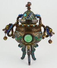 5 - CHINESE GILT SILVER FILIGREE ENAMEL DRAGON CENSER Chinese enameled silver censer with dragon form handles on tripod legs. Accented with carved jade medallions and turquoise cabochons. Marked Silver to underside. Measures 6 3/4" height x 6" width.