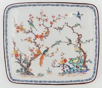 7 - 18th C CHANTILLY KAKIEMON STYLE PORCELAIN TRAY 18th century Chantilly Kakiemon style porcelain tray of rectangular form. Depicts birds perched on floral branches. Holds red hunting horn mark to underside. Measures 12 1/2" x 10 7/8".