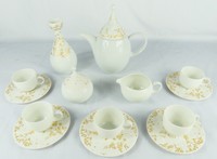 8 - 14pc ROSENTHAL BJORN WIINBLAD MAGIC FLUTE TEA SET 14pc Bjorn Wiinblad for Rosenthal porcelain demitasse set in the Magic Flute pattern with gold highlights. Includes five demitasse cups-2 7/8", five saucers-4 3/4", coffee pot-7 1/4", covered sugar bowl-4", creamer-4 1/4" and vase (?)-6". Each piece marked to underside.