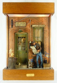 9 - MICHAEL GARMAN 'DOOR WINDOW' DIORAMA Michael Garman (American, born 1938) mixed media sculpture with plexiglass depicting a cityscape with figures. Titled 'Door Window'. Holds brass plaque to lower edge. Measures 29 1/4" height x 19 1/2" width x 10" depth.