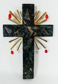 10 - SALVADOR DALI 'CRUCIFIXION' MARBLE SCULPTURE Salvador Dali green and black marble sculpture depicting a cross / crucifix with brass appliques, metal rays, and red glass beads. Signed to front, near center. Numbered 193/375 and marked Dalart N.V. to verso. Measures 14 1/2" x 9 1/2".