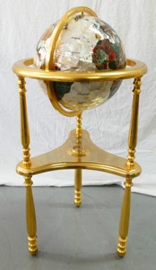 12 - HANDCRAFTED SEMI-PRECIOUS STONE GLOBE ON STAND Semi-precious stone globe on brass stand. Composed of semi-previous gemstones and mother of pearl. Rotating globe rising on three legs supported by a central stretcher with an inset compass, Measures 37" height x 18" diameter.