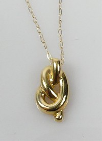17 - 14kt ANGELA CUMMINGS 'LOVE KNOT' PENDANT w CHAIN 14kt Angela Cummings pendant in the form of a Love Knot. Each marked 585 or 14K. Measures 5/8" with bail. Chain measures 17" length.