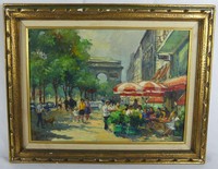 23 - ANDRE MICHEL 'CHAMPS ELYSEES' OIL ON CANVAS Andre Michel (French, b. 1945) oil painting on canvas depicting Champs Elysees. Signed lower left. Measures 17 1/2" x 12 1/2" + 2 3/4" frame.