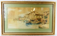 24 - ALESSANDRO GUACCIMANNI VENETIAN WATERCOLOR Alessandro Guaccimanni (Italian, 1864-1927) watercolor on paper depicting a Venetian Canal scene. Sugned, dated 1895 and inscribed Venezia lower right. Measures 24" x 12 1/4" + 3 1/4" mat & frame.