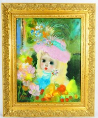 25 - SANTINI PONCINI OIL PAINTING ON CANVAS Santini Poncini oil painting on canvas depicting a blonde girl with pink hat fruits and flowers. Signed lower left. Measures 13 1/4" x 10 1/4" + 2 1/4" frame.