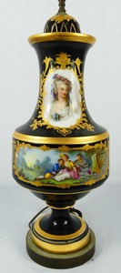 26 - ANTIQUE FRENCH PORCELAIN PORTRAIT URN SEVRES Antique French Sevres style hand painted cobalt porcelain urn mounted as a lamp. Depicts the portrait of an 19th century Victorian woman above a scene with three seated figures. Porcelain measures 20" height. Lamp measures 31 1/2" overall height.
