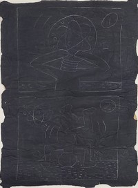 30b - KEITH HARING SUBWAY SERIES CHALK DRAWING ON PAPER Subway Series chalk drawing on black paper attributed to Keith Haring (American 1958-1990). Having two panels. First panel depicts a figure with atomic head. Second panel depicts a figure doing handstand. No apparent signature. Measures 48" x 33".