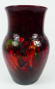31 - MOORCROFT FLAMBE LEAF & BERRY VASE William Moorcroft flambe pottery vase having leaf and berry motif. Impressed marks to underside. Measures 9 1/4" height.