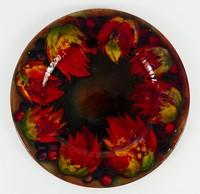 32 - MOORCROFT FLAMBE LEAF & BERRY CHARGER William Moorcroft pottery charger having leaf and berry motif. Impressed mark to underside. Measures 11 3/4" diameter.
