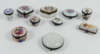 33 - 10pc FRENCH PORCELAIN TRINET BOXES Ten Sevres style French porcelain trinket boxes. Most having floral motif and Sevres style mark. Round white box is unmarked. Each measures 1 1/2" to 2 1/2".