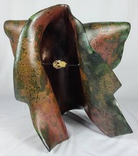 38 - ETSUKO SAKIMURA MODERN CERAMIC SCULPTURE Etsuko Sakimura (Japanese/American, b. 1941) raku fired ceramic sculpture of a kimono having a mixed metal pendant secured with string. Marked to underside. Measures 15 1/2" height x 16" width.