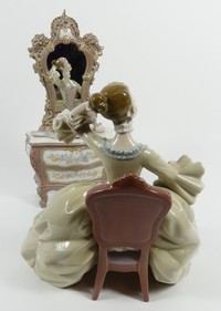 39 - LLADRO 'LADY AT DRESSING TABLE' PORCELAIN FIGURINE Two piece Lladro titled 'Lady at Dressing Table' #1242. Includes seated lady in formal dress 9 1/4" h x 9" l and separate dressing mirror-12 1/4" height. Lady is marked to underside.
