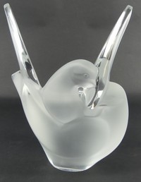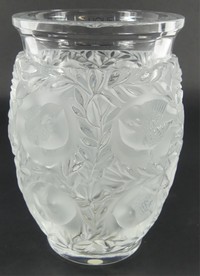 48 - LALIQUE 'BAGATELLE' FROSTED CRYSTAL VASE Lalique frosted crystal vase having doves in relief with olive branches. Clear rim and base. Signed to underside. Measures 6 3/4" height.