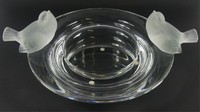 46 - LALIQUE 'DEUX MOINEAUX MOQUEURS' CRYSTAL BOWL Lalique French frosted crystal bowl titled 'Two Mocking Sparrows'. Heavy colorless glass bowl mounted with two frosted sparrows. Signed to underside. Measures 15 3/4" length x 12" width x 6 1/4" height.