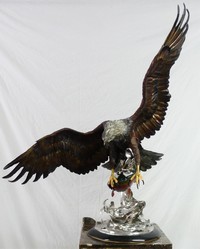 8 - CHESTER FIELDS 'ON THE WINGS OF AN EAGLE' BRONZE Chester Fields (American, b. 1945) bronze and steel polychromed sculpture depicting an Eagle in flight with salmon. Titled 'On the Wings of an Eagle, 1984'. Inscribed Chester Fields, dated 1991 and numbered 57/75. Measures 51" height x 42" wingspan x 20" depth. Pedestal measures 49" height.