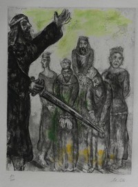 9 - MARC CHAGALL JOSHUA & THE VANQUISHED KINGS ETCHING Marc Chagall hand colored etching titled 'Joshua and the Vanquished Kings'. Depicts Joshua bearing a sword and speaking before the five defeated Amorite kings. Pencil signed and holds watermark lower right and numbered 80/100 lower left. Measures 17 3/8" x 13 1/4".