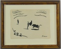 10 - PABLO PICASSO ORIGINAL INK DRAWING ON PAPER Pablo Picasso original ink drawing on paper depicting a bullfight in an arena. Signed lower right. Sheet measures 11 3/4" x 8 7/8". Frame measures 18 1/2" x 15" x 2". Provenance: Acquired directly from the artist by Mr. Carlos Franqui, a Cuban National and an Italian citizen bequeathed to Camilo Sergio Franqui-Padron (the prior owner's son). Documentation available upon request.
