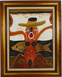 13 - FRANCISCO TOLEDO OIL PAINTING ON PAPER Oil painting on paper laid on canvas depicting a seated nude figure with fish attributed to Francisco Benjamin Lopez Toledo (Mexican, 1940-2019). Signed lower left. Viewable 23 1/2" x 17 1/2". Frame measures 31 1/2" x 25 3/8" x 1 3/4".
