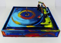 14 - PETER MAX ACRYLIC PAINTED RECORD PLAYER SIGNED Peter Max record player painted in bold colors with acrylic. Signed to side. Measures 16" x 14" x 6 1/2" h.